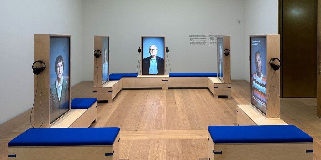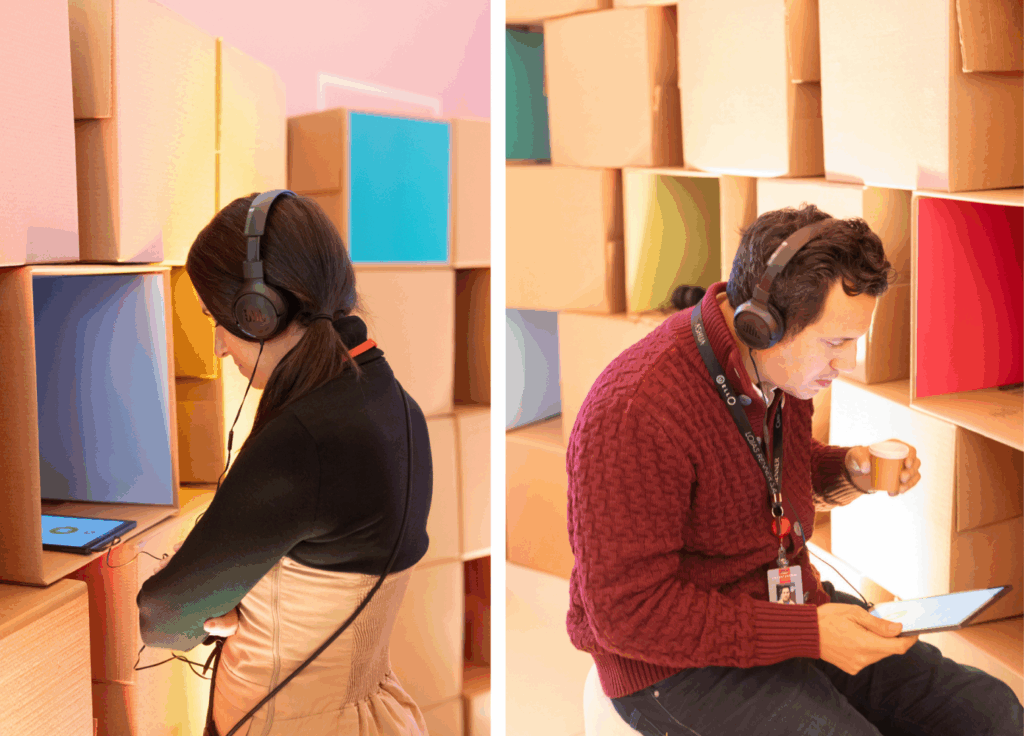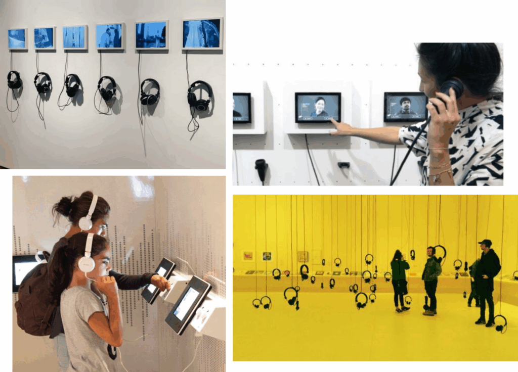 Quando desenhamos o Museu de Pessoas para projetos corporativos, focamos em uma arquitetura mínima exatamente para tornar a escuta máxima: ilhas de áudio com pequenas cápsulas de vídeo ou fotos, mas às vezes nem isso. A pessoa entra, escolhe um depoimento, e o resto é entre ela e a voz de alguém, seja um colega, cliente ou parceiro.