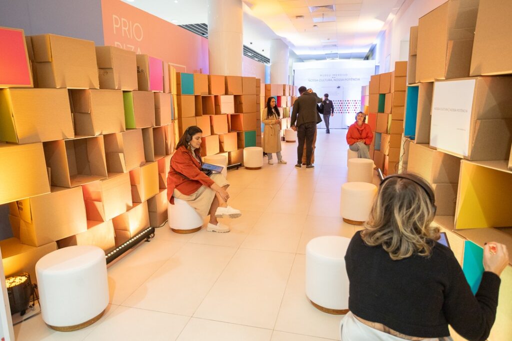 Na LRSA, o Museu de Pessoas ocupou todo o foyer. Montamos ilhas de escuta com fones e pequenas que funcionavam como “chaves” para cada história. Entre 3 a 6 minutos, o visitante escolhe um depoimento: clientes, por exemplo, contam não só como usam o produto (onde ajuda, onde falha e como entra ou não na rotina) mas também suas histórias de conexão com a marca. Teve até uma história de vestido de casamento comprado de última hora na Renner!